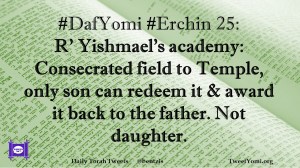 DafYomi, Erchin #DafYomi #Erchin 25 Date: July 12, 2019Author: ysspitz #DafYomi #Erchin 25: R’ Yishmael’s academy: Consecrated field to Temple, only son can redeem it & award it back to the father. Not daughter. Share this: Share on X (Opens in new window) X Share on Facebook (Opens in new window) Facebook Like Loading... Related