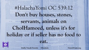 #HalachaYomi OC 539:12 Don’t buy houses, stones, servants, animals on CholHamoed, unless it’s for holiday or if seller has no food to eat.
