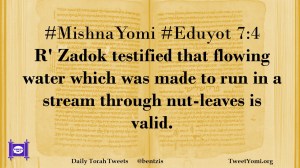 Eduyot, MishnaYomi #MishnaYomi #Eduyot 7:4 Date: July 17, 2019Author: ysspitz #MishnaYomi #Eduyot 7:4 R’ Zadok testified that flowing water which was made to run in a stream through nut-leaves is valid. Share this: Share on X (Opens in new window) X Share on Facebook (Opens in new window) Facebook Like Loading... Related