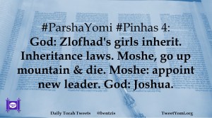 #ParshaYomi #Pinhas 4: God: Zlofhad’s girls inherit. Inheritance laws. Moshe, go up mountain & die. Moshe: appoint new leader. God: Joshua.