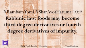 #RambamYomi #SharAvotHatuma 10:9 Rabbinic law: foods may become third degree derivatives or fourth degree derivatives of impurity.