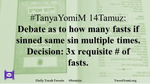 TanyaYomiM #TanyaYomiM 14Tamuz Date: July 17, 2019Author: ysspitz #TanyaYomiM 14Tamuz: Debate as to how many fasts if sinned same sin multiple times. Decision: 3x requisite # of fasts. Share this: Share on X (Opens in new window) X Share on Facebook (Opens in new window) Facebook Like Loading... Related