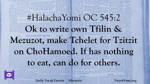#HalachaYomi OC 545:2 Ok to write own Tfilin & Mezuzot, make Tchelet for Tzitzit on ChoHamoed. If has nothing to eat, can do for others.