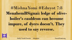 #MishnaYomi #Eduyot 7:8 MenahemBSignai: ledge of olive-boiler’s cauldron can become impure, of dyers doesn’t. They used to say reverse.