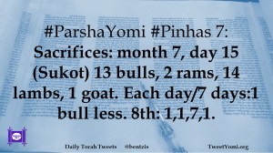 #ParshaYomi #Pinhas 7: Sacrifices: month 7, day 15 (Sukot) 13 bulls, 2 rams, 14 lambs, 1 goat. Each day/7 days:1 bull less. 8th: 1,1,7,1.
