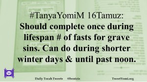 #TanyaYomiM 16Tamuz: Should complete once during lifespan # of fasts for grave sins. Can do during shorter winter days & until past noon.