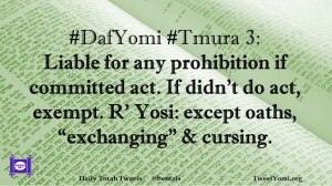 DafYomi, Tmura #DafYomi #Tmura 3 Date: July 23, 2019Author: ysspitz #DafYomi #Tmura 3: Liable for any prohibition if committed act. If didn’t do act, exempt. R’ Yosi: except oaths, “exchanging” & cursing. Share this: Share on X (Opens in new window) X Share on Facebook (Opens in new window) Facebook Like Loading... Related