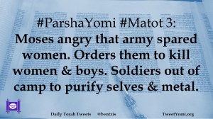 #ParshaYomi #Matot 3: Moses angry that army spared women. Orders them to kill women & boys. Soldiers out of camp to purify selves & metal.
