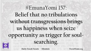#EmunaYomi 157: Belief that no tribulations without transgressions brings us happiness when seize opportunity as trigger for soul-searching.