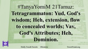 #TanyaYomiM 21Tamuz: Tetragrammaton: Yud, God’s wisdom; Heh, extension, flow to concealed worlds; Vav, God’s Attributes; Heh, Dominion.