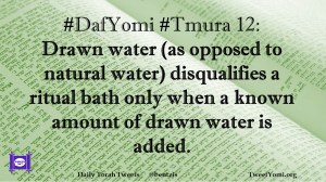 DafYomi, Tmura #DafYomi #Tmura 12 Date: July 31, 2019Author: ysspitz #DafYomi #Tmura 12: Drawn water (as opposed to natural water) disqualifies a ritual bath only when a known amount of drawn water is added. Share this: Share on X (Opens in new window) X Share on Facebook (Opens in new window) Facebook Like Loading... Related