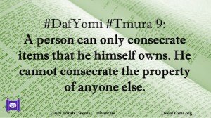 DafYomi, Tmura #DafYomi #Tmura 9 Date: July 31, 2019Author: ysspitz #DafYomi #Tmura 9: A person can only consecrate items that he himself owns. He cannot consecrate the property of anyone else. Share this: Share on X (Opens in new window) X Share on Facebook (Opens in new window) Facebook Like Loading... Related