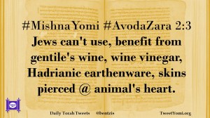 #MishnaYomi #AvodaZara 2:3 Jews can’t use, benefit from gentile’s wine, wine vinegar, Hadrianic earthenware, skins pierced @ animal’s heart.