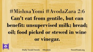 #MishnaYomi #AvodaZara 2:6 Can’t eat from gentile, but can benefit: unsupervised milk; bread; oil; food picked or stewed in wine or vinegar.