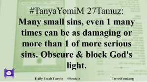 #TanyaYomiM 27Tamuz: Many small sins, even 1 many times can be as damaging or more than 1 of more serious sins. Obscure & block God’s light.