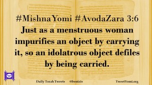 #MishnaYomi #AvodaZara 3:6 Just as a menstruous woman impurifies an object by carrying it, so an idolatrous object defiles by being carried.