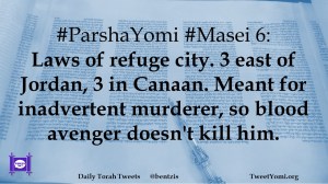 #ParshaYomi #Masei 6: Laws of refuge city. 3 east of Jordan, 3 in Canaan. Meant for inadvertent murderer, so blood avenger doesn’t kill him.