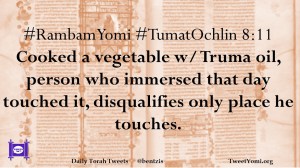 #RambamYomi #TumatOchlin 8:11 Cooked a vegetable w/ Truma oil, person who immersed that day touched it, disqualifies only place he touches.