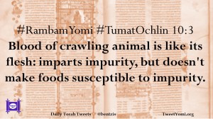 #RambamYomi #TumatOchlin 10:3 Blood of crawling animal is like its flesh: imparts impurity, but doesn’t make foods susceptible to impurity.