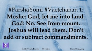 #ParshaYomi #Vaetchanan 1: Moshe: God, let me into land. God: No. See from mount. Joshua will lead them. Don’t add or subtract commandments.
