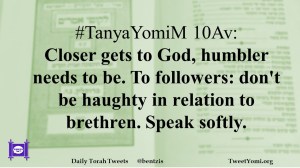 #TanyaYomiM 10Av: Closer gets to God, humbler needs to be. To followers: don’t be haughty in relation to brethren. Speak softly.