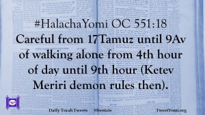 #HalachaYomi OC 551:18 Careful from 17Tamuz until 9Av of walking alone from 4th hour of day until 9th hour (Ketev Meriri demon rules then).