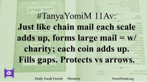 #TanyaYomiM 11Av: Just like chain mail each scale adds up, forms large mail = w/ charity; each coin adds up. Fills gaps. Protects vs arrows.