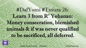 DafYomi, Tmura #DafYomi #Tmura 26 Date: August 16, 2019Author: ysspitz #DafYomi #Tmura 26: Learn 3 from R’ Yohanan: Money consecration, blemished animals & if was never qualified to be sacrificed, all deferred. Share this: Share on X (Opens in new window) X Share on Facebook (Opens in new window) Facebook Like Loading... Related