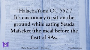 HalachaYomi #HalachaYomi OC 552:7 Date: August 16, 2019Author: ysspitz #HalachaYomi OC 552:7 It’s customary to sit on the ground while eating Seuda Mafseket (the meal before the fast) of 9Av. Share this: Share on X (Opens in new window) X Share on Facebook (Opens in new window) Facebook Like Loading... Related