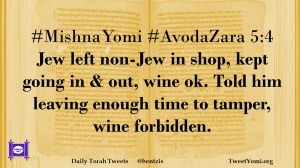 #MishnaYomi #AvodaZara 5:4 Jew left non-Jew in shop, kept going in & out, wine ok. Told him leaving enough time to tamper, wine forbidden.