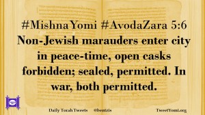 #MishnaYomi #AvodaZara 5:6 Non-Jewish marauders enter city in peace-time, open casks forbidden; sealed, permitted. In war, both permitted.