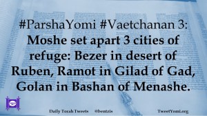 #ParshaYomi #Vaetchanan 3: Moshe set apart 3 cities of refuge: Bezer in desert of Ruben, Ramot in Gilad of Gad, Golan in Bashan of Menashe.