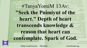 #TanyaYomiM 13Av: “Seek the Pnimiyut of the heart.” Depth of heart transcends knowledge & reason that heart can contemplate. Spark of God.