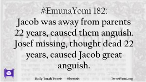 #EmunaYomi 182: Jacob was away from parents 22 years, caused them anguish. Josef missing, thought dead 22 years, caused Jacob great anguish.
