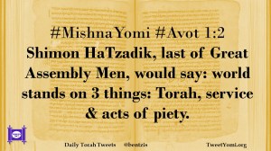 #MishnaYomi #Avot 1:2 Shimon HaTzadik, last of Great Assembly Men, would say: world stands on 3 things: Torah, service & acts of piety.
