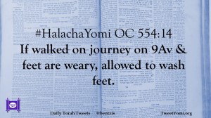HalachaYomi #HalachaYomi OC 554:14 Date: August 21, 2019Author: ysspitz #HalachaYomi OC 554:14 If walked on journey on 9Av & feet are weary, allowed to wash feet. Share this: Share on X (Opens in new window) X Share on Facebook (Opens in new window) Facebook Like Loading... Related