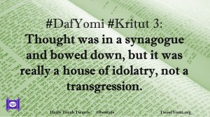 DafYomi, Kritut #DafYomi #Kritut 3 Date: August 23, 2019Author: ysspitz #DafYomi #Kritut 3: Thought was in a synagogue and bowed down, but it was really a house of idolatry, not a transgression. Share this: Share on X (Opens in new window) X Share on Facebook (Opens in new window) Facebook Like Loading... Related