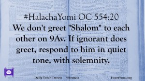 #HalachaYomi OC 554:20 We don’t greet “Shalom” to each other on 9Av. If ignorant does greet, respond to him in quiet tone, with solemnity.
