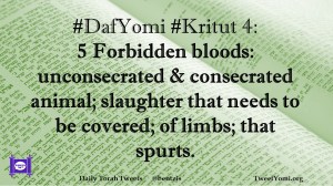 DafYomi, Kritut #DafYomi #Kritut 4:5 Date: August 27, 2019Author: ysspitz #DafYomi #Kritut 4: 5 Forbidden bloods: unconsecrated & consecrated animal; slaughter that needs to be covered; of limbs; that spurts. Share this: Share on X (Opens in new window) X Share on Facebook (Opens in new window) Facebook Like Loading... Related