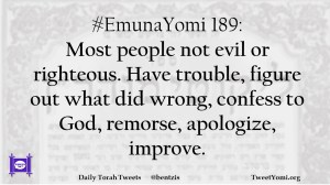 #EmunaYomi 189: Most people not evil or righteous. Have trouble, figure out what did wrong, confess to God, remorse, apologize, improve.