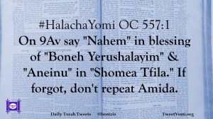 #HalachaYomi OC 557:1 On 9Av say “Nahem” in blessing of “Boneh Yerushalayim” & “Aneinu” in “Shomea Tfila.” If forgot, don’t repeat Amida.