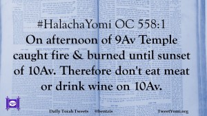 #HalachaYomi OC 558:1 On afternoon of 9Av Temple caught fire & burned until sunset of 10Av. Therefore don’t eat meat or drink wine on 10Av.