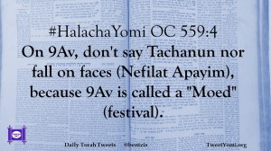 #HalachaYomi OC 559:4 On 9Av, don’t say Tachanun nor fall on faces (Nefilat Apayim), because 9Av is called a “Moed” (festival).