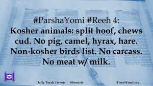 #ParshaYomi #Reeh 4: Kosher animals: split hoof, chews cud. No pig, camel, hyrax, hare. Non-kosher birds list. No carcass. No meat w/ milk.