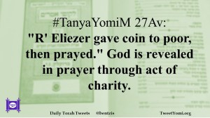 TanyaYomiM #TanyaYomiM 27Av Date: August 28, 2019Author: ysspitz #TanyaYomiM 27Av: “R’ Eliezer gave coin to poor, then prayed.” God is revealed in prayer through act of charity. Share this: Share on X (Opens in new window) X Share on Facebook (Opens in new window) Facebook Like Loading... Related