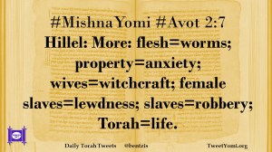 #MishnaYomi #Avot 2:7 Hillel: More: flesh=worms; property=anxiety; wives=witchcraft; female slaves=lewdness; slaves=robbery; Torah=life.