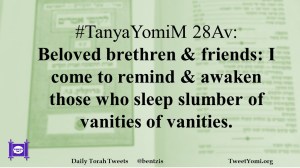 TanyaYomiM #TanyaYomiM 28Av Date: August 29, 2019Author: ysspitz #TanyaYomiM 28Av: Beloved brethren & friends: I come to remind & awaken those who sleep slumber of vanities of vanities. Share this: Share on X (Opens in new window) X Share on Facebook (Opens in new window) Facebook Like Loading... Related