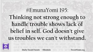 #EmunaYomi 195: Thinking not strong enough to handle trouble shows lack of belief in self. God doesn’t give us troubles we can’t withstand.
