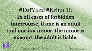 DafYomi, Kritut #DafYomi #Kritut 11 Date: September 1, 2019Author: ysspitz #DafYomi #Kritut 11: In all cases of forbidden intercourse, if one is an adult and one is a minor, the minor is exempt, the adult is liable. Share this: Share on X (Opens in new window) X Share on Facebook (Opens in new window) Facebook Like Loading... Related