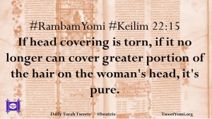 #RambamYomi #Keilim 22:15 If head covering is torn, if it no longer can cover greater portion of the hair on the woman’s head, it’s pure.